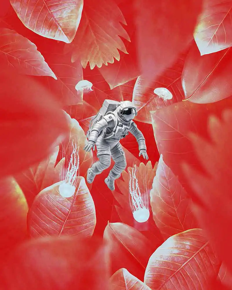 رائد فضاء باللون الأحمر البحري، عمل فني يُعيد تصور سير رواد الفضاء التقليدي في عالم تحت الماء سريالي نابض بالحياة، تهيمن عليه درجات اللون الأحمر الداكن والغني. يجمع هذا العمل الفني الآسر بين عناصر استثنائية وغير متوقعة لخلق قصة بصرية آسرة.