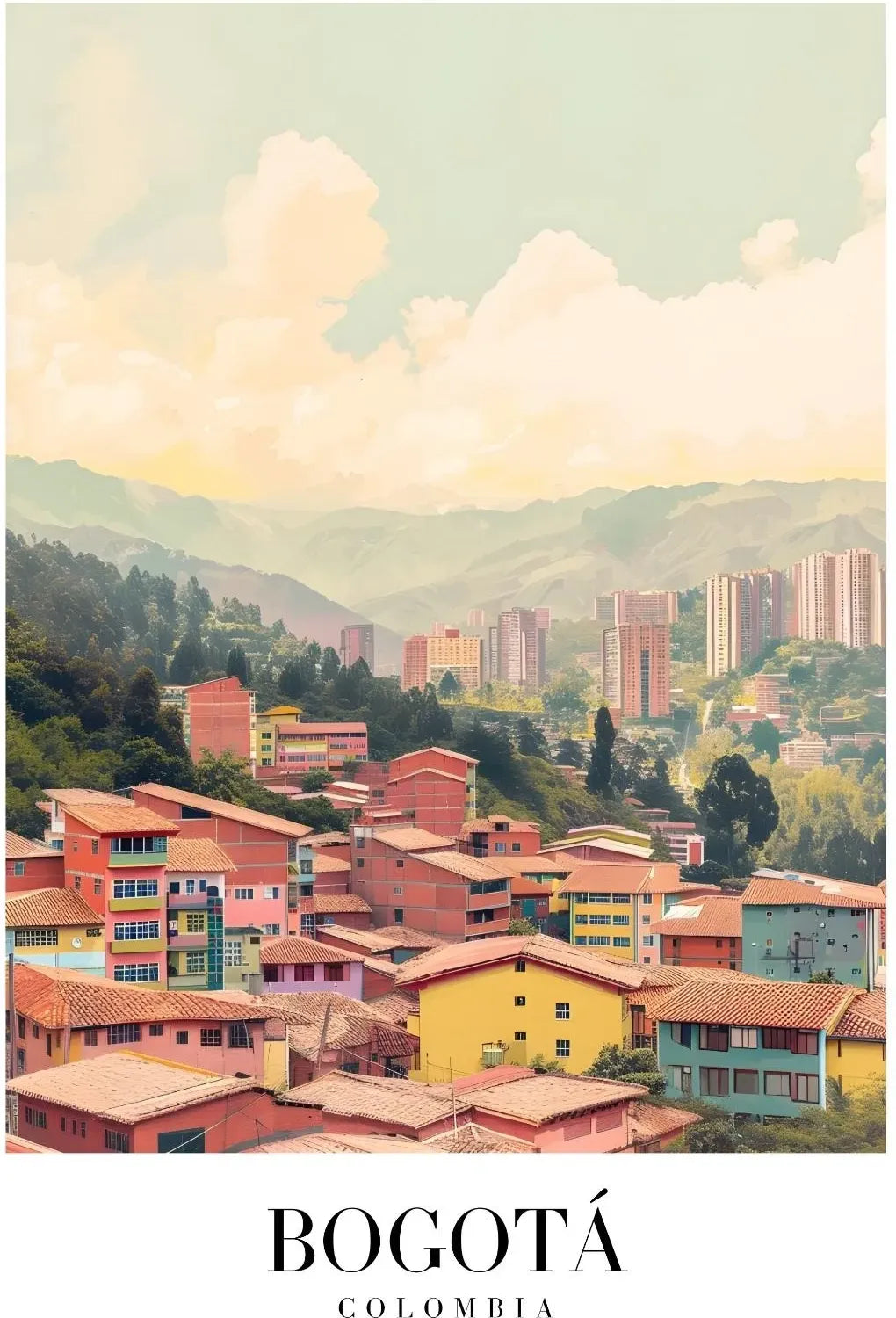 استمتع بالسحر الثقافي لمدينة بوغوتا الكولومبية من خلال هذه اللوحة الفنية المعبرة.