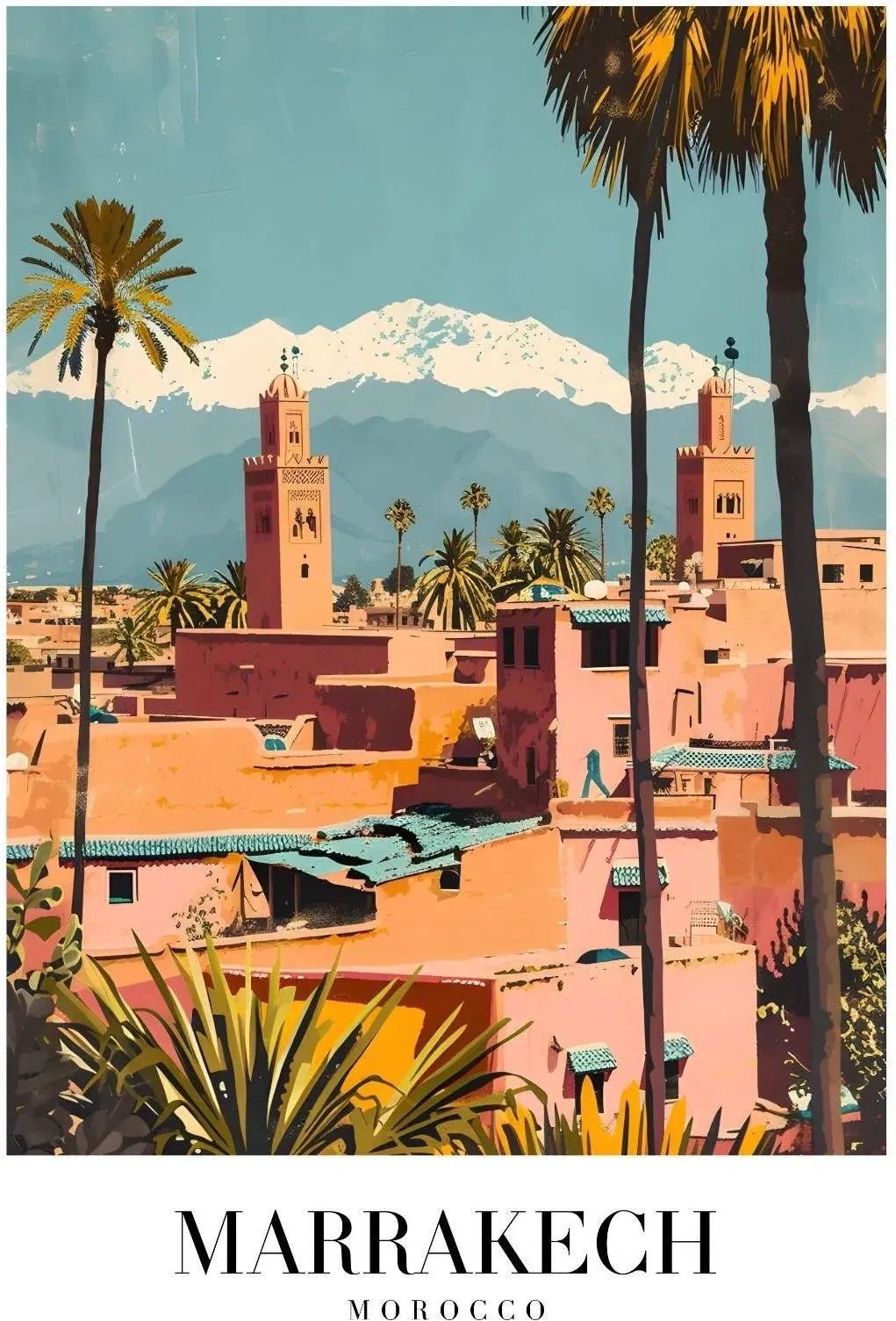 استمتع بالسحر الثقافي لمدينة مراكش المغربية من خلال هذه اللوحة الفنية المعبرة.