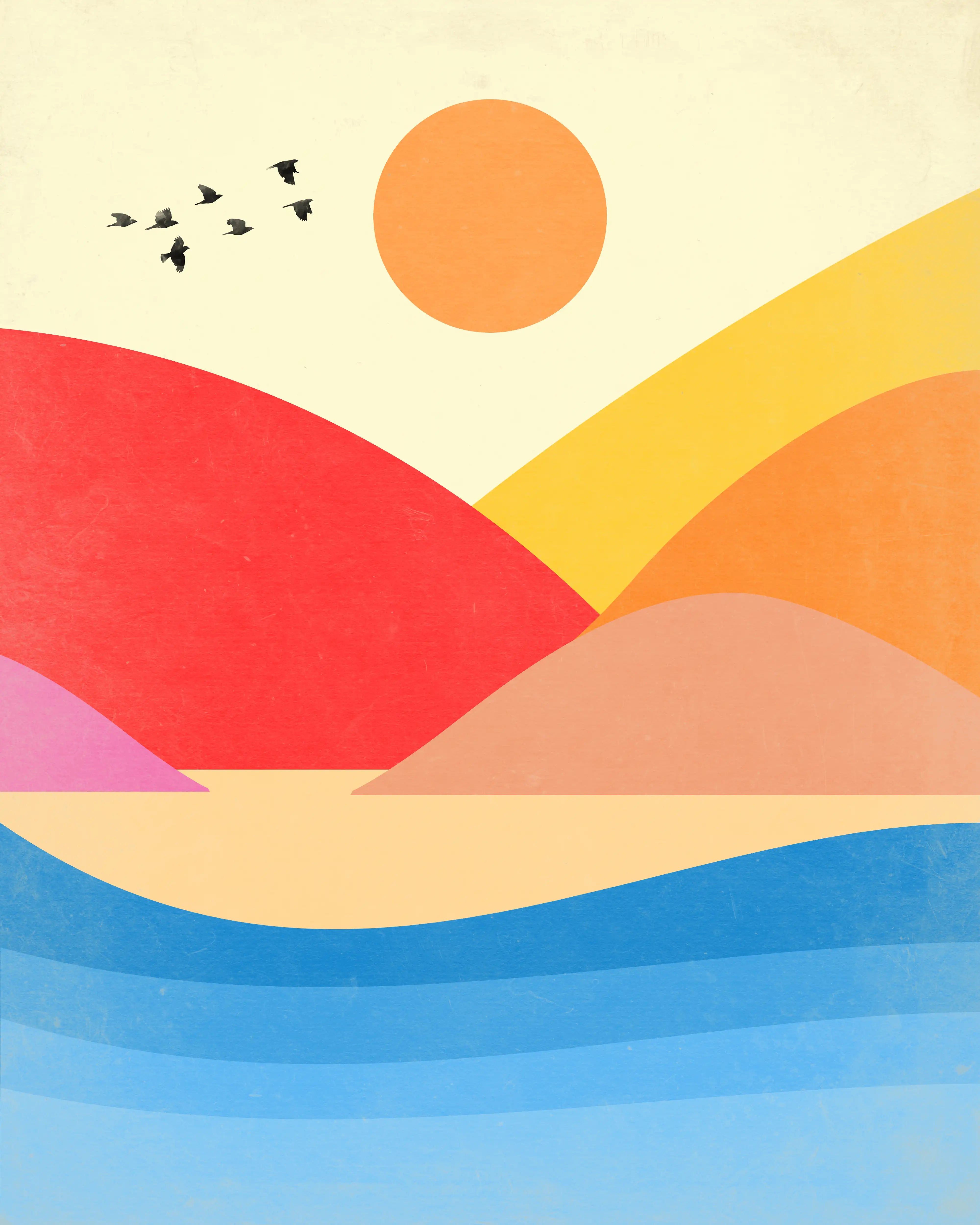 هذا العمل الفني تجسيدٌ نابضٌ بالحياة لمناظر الجبال، بألوانٍ جريئةٍ وخطوطٍ جرافيكيةٍ وأشكالٍ منمقةٍ تُجسّد حيويةَ فن البوب ​​وروحه. في اللوحة، تبرز عناصرٌ مرحةٌ، كالطيور المُنمقة التي تُحلّق في السماء، والغيوم المُفعمة بالحيوية التي تبدو وكأنها تتراقص عبر العمل الفني.