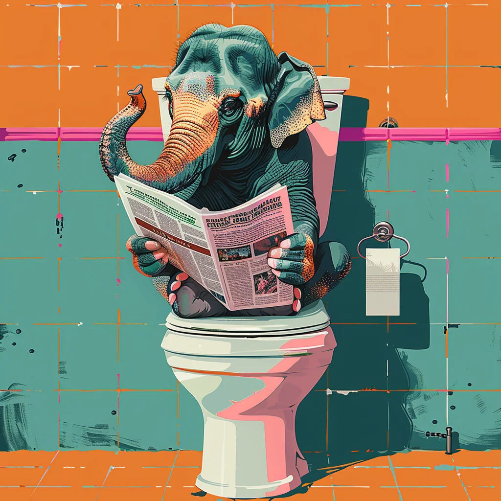 Elephant On Toilet Reading Newspaper 2 is a high-quality art print from ArtSmiley Decor.