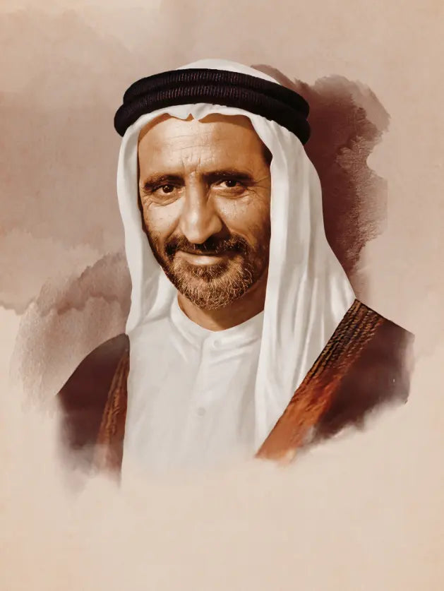 A grunge-style portrait of Sheikh Rashid Bin Saeed Al Maktoum, portrayed with timeless elegance and royal stature.