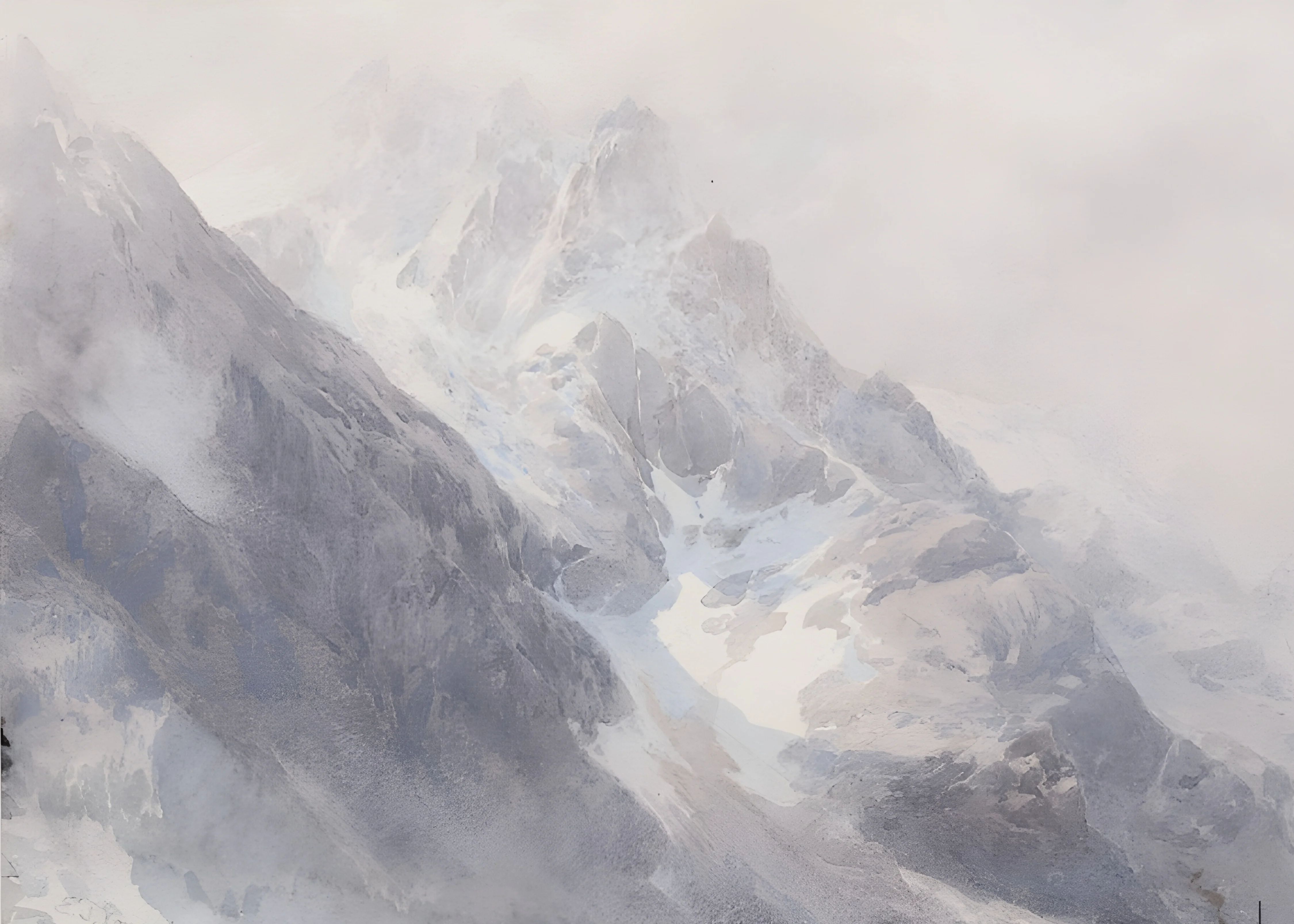 Quiet mountain peaks under soft sky. Cool blues and misty layers drift. Perfect for hallways or studies. Add mountain calm to your space.